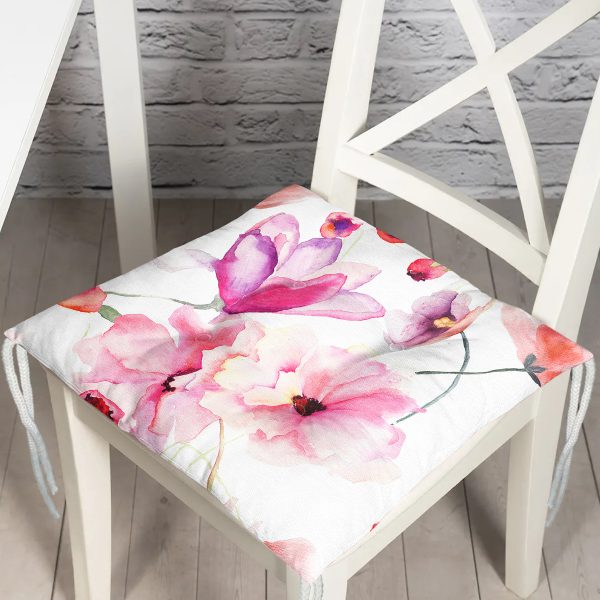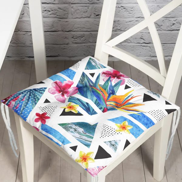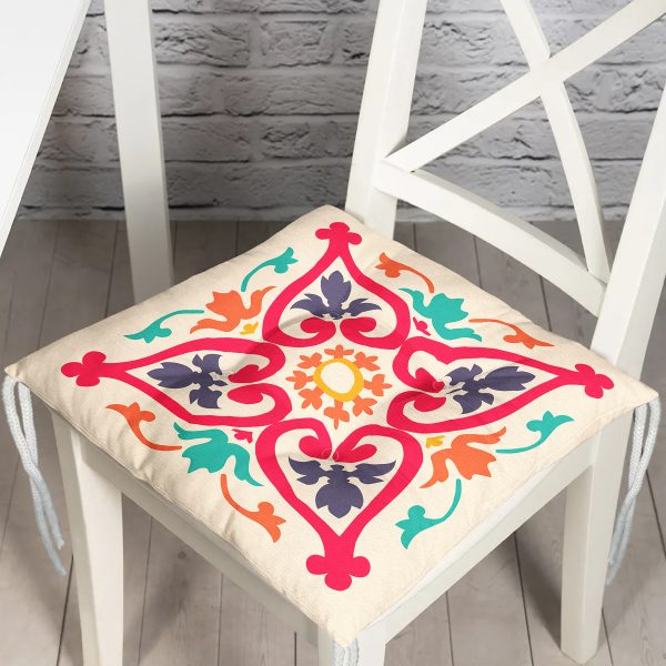 Rengarenk Zemin Üzerinde Beyaz Çiçek Desenli Dijital Baskılı Modern Pofuduk Sandalye Minderi