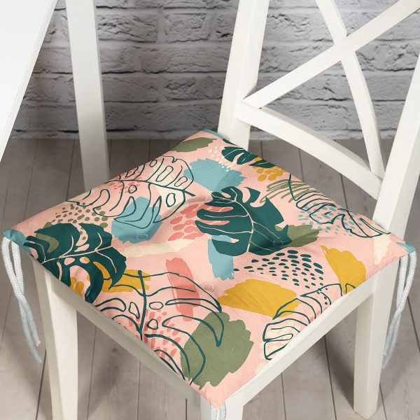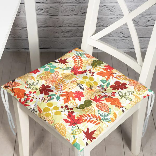 Beyaz Zemin Üzerinde Renkli Yaprak Desenli Dijital Baskılı Modern Pofuduk Sandalye Minderi