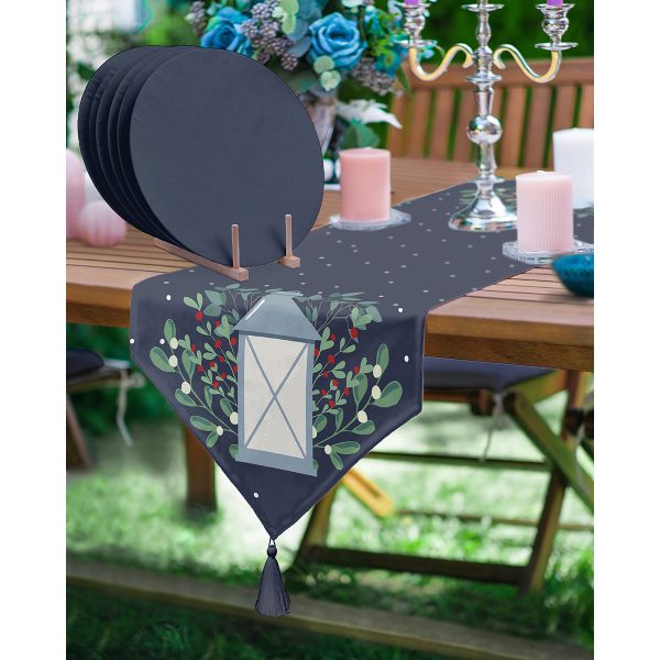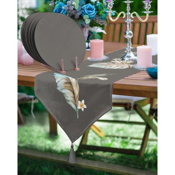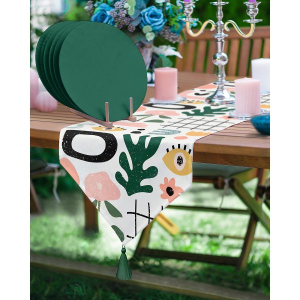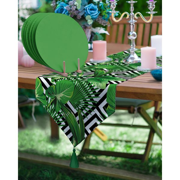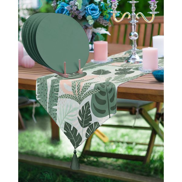 Realhomes Tropik Yaprak Tasarımlı Üçgen Püsküllü Runner 1 Adet & 6 Adet Koyu Yeşil Renkli Supla