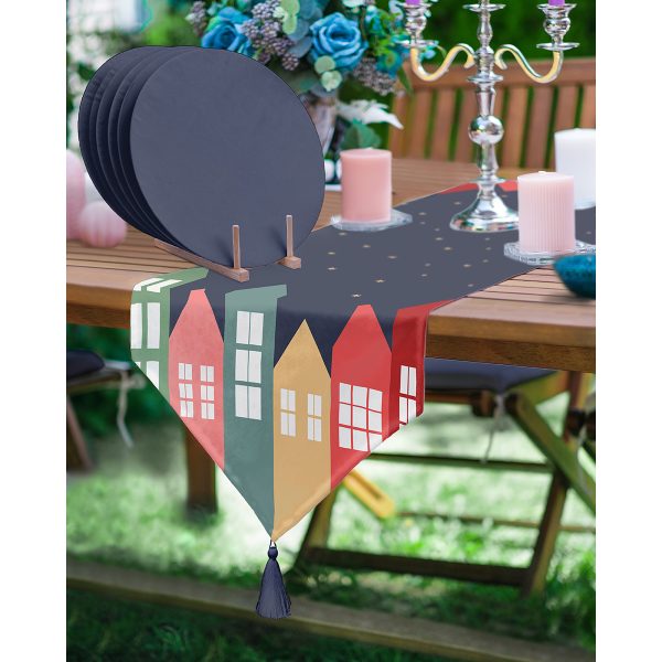 Realhomes Lacivert Zeminli Renkli Ev Motifli Üçgen Püsküllü Runner 1 Adet & 6 Adet Lacivert Renkli Supla