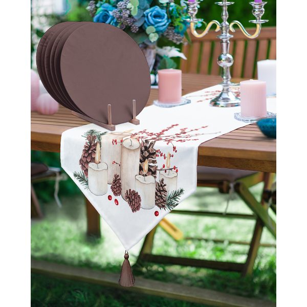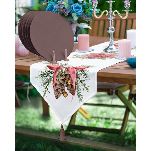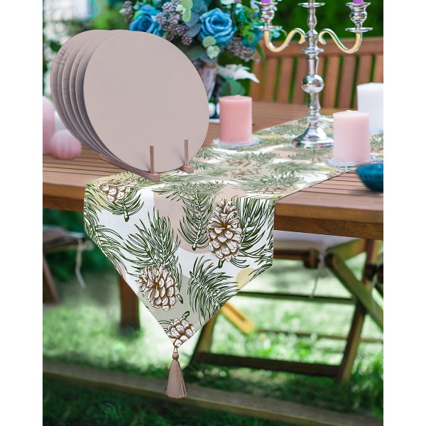 Realhomes Yılbaşı Temalı Kozalak Tasarımlı Üçgen Püsküllü Runner 1 Adet & 6 Adet Vizon Renkli Supla