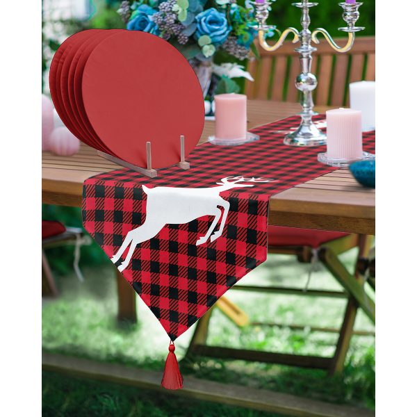 Realhomes Ekose Zeminli Geyik Motifli Üçgen Püsküllü Runner 1 Adet & 6 Adet Kırmızı Renkli Supla
