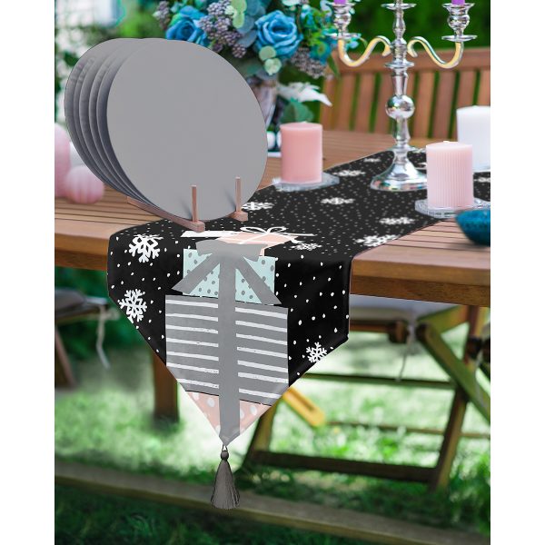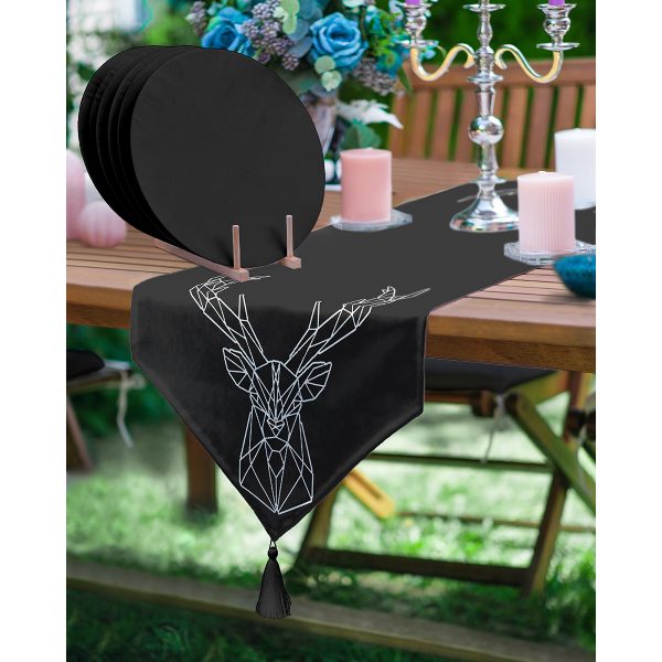 Realhomes Siyah Zemin Geyik Tasarımlı Üçgen Püsküllü Runner 1 Adet & 6 Adet Siyah Renkli Supla