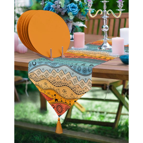 Realhomes Renkli Etnik Desen Motifli Üçgen Püsküllü Runner 1 Adet & 6 Adet Turuncu Renkli Supla