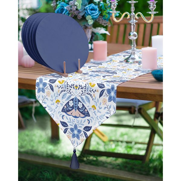 Realhomes Çiçek & Kelebekli Özel Tasarım Üçgen Püsküllü Runner 1 Adet & 6 Adet Lacivert Rengarenk Supla