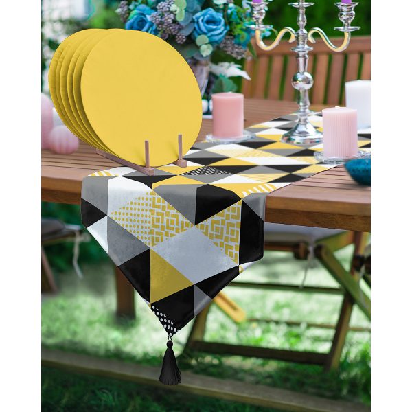 Realhomes Üçgen Sarı Siyah Geometrik Çizimli Üçgen Püsküllü Runner 1 Adet & 6 Adet Sarı Renkli Supla