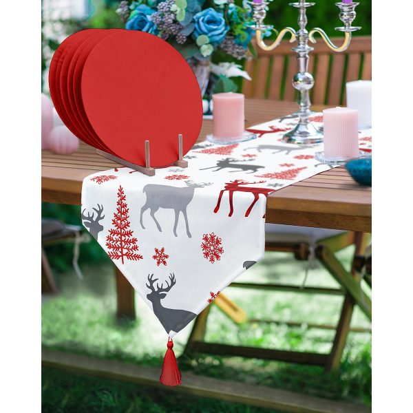 Realhomes Yılbaşı Geyikleri Üçgen Püsküllü Runner 1 Adet & 6 Adet Kırmızı Renkli Supla