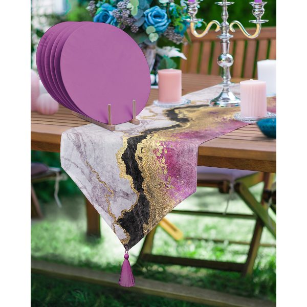 Realhomes Gold Detaylı Mavi Mermer Desenli Üçgen Püsküllü Runner 1 Adet & 6 Adet Mor Renkli Supla