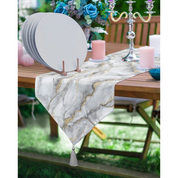 Realhomes Gold Detaylı Mavi Mermer Desenli Üçgen Püsküllü Runner 1 Adet & 6 Adet Gri Renkli Supla
