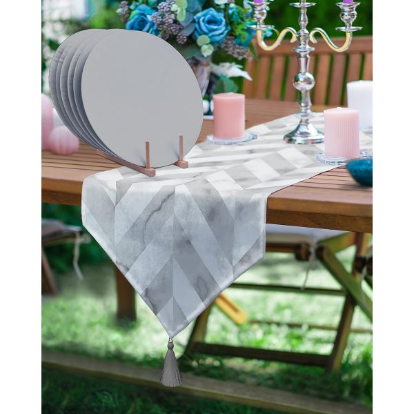 Realhomes Gri Zigzag Mermer Desenli Üçgen Püsküllü Runner 1 Adet & 6 Adet Gri Renkli Supla