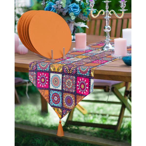 Realhomes Etnik Kareli Baskılı Üçgen Püsküllü Runner 1 Adet & 6 Adet Turuncu Renkli Supla