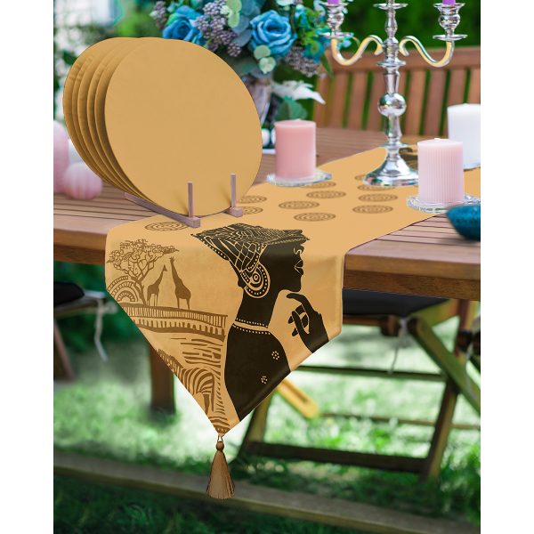 Realhomes Siyahi Etnik Afrika Kadın Tasarımlı Üçgen Püsküllü Runner 1 Adet & 6 Adet Hardal Renkli Supla