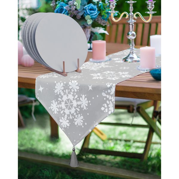 Realhomes Gri Zemin Kar Taneli Üçgen Püsküllü Runner 1 Adet & 6 Adet Gri Renkli Supla