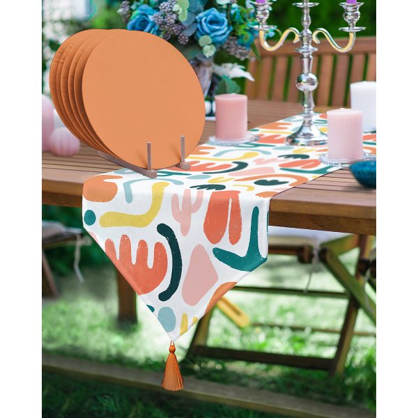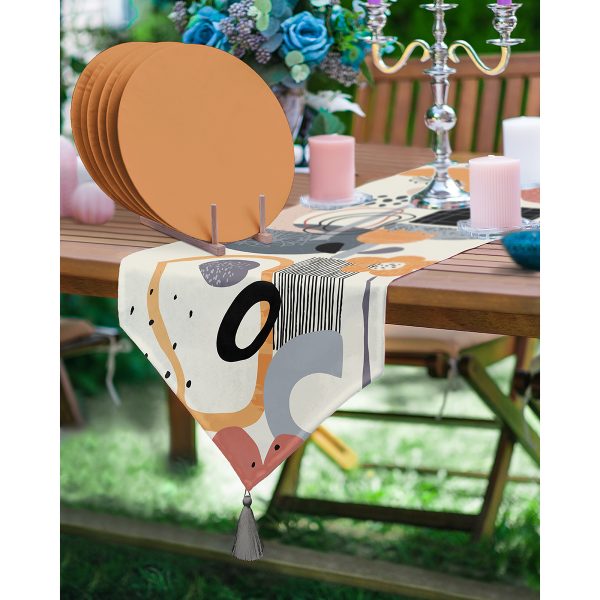 Realhomes Renkli Onedraw Motifli Üçgen Püsküllü Runner 1 Adet & 6 Adet Turuncu Renkli Supla