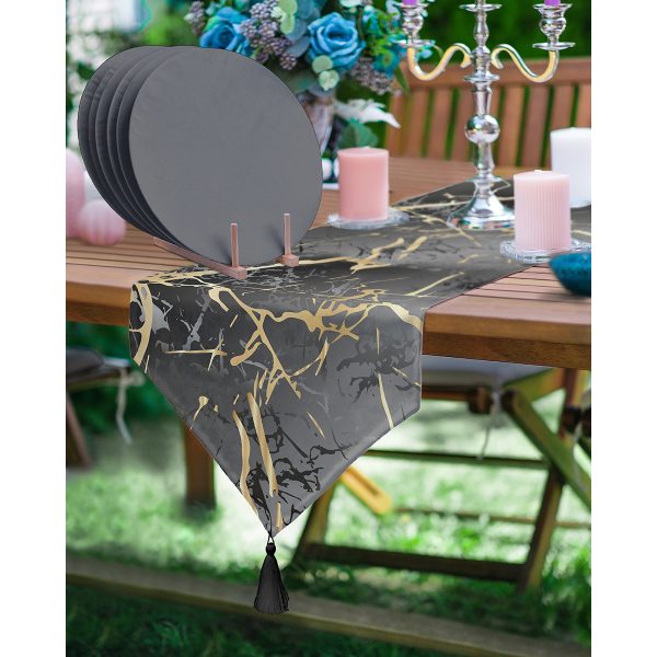 Realhomes Gold Detaylı Siyah Mermer Motifli Üçgen Püsküllü Runner 1 Adet & 6 Adet Koyu Gri Renkli Supla