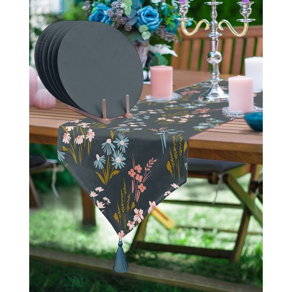 Realhomes Koyu Zeminli Renkli Papatya Motifli Üçgen Püsküllü Runner 1 Adet & 6 Adet Koyu Gri Renkli Supla