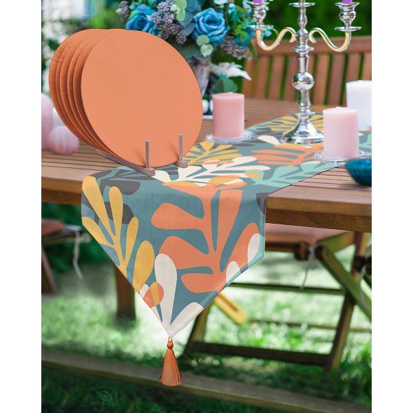 Realhomes Renkli Tropik Yaprak Tasarımlı Üçgen Püsküllü Runner 1 Adet & 6 Adet Turuncu Renkli Supla