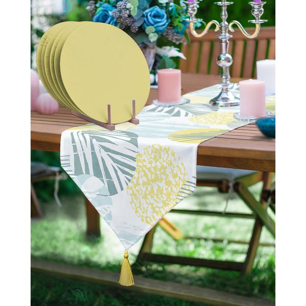 Realhomes Soft Tropik Yaprak Tasarımlı Üçgen Püsküllü Runner 1 Adet & 6 Adet Sarı Renkli Supla