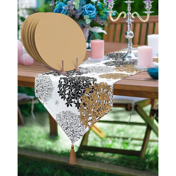 Realhomes Kahve & Siyah & Beyaz Çiçek Motifli Üçgen Püsküllü Runner 1 Adet & 6 Adet Kahve Rengarenk Supla