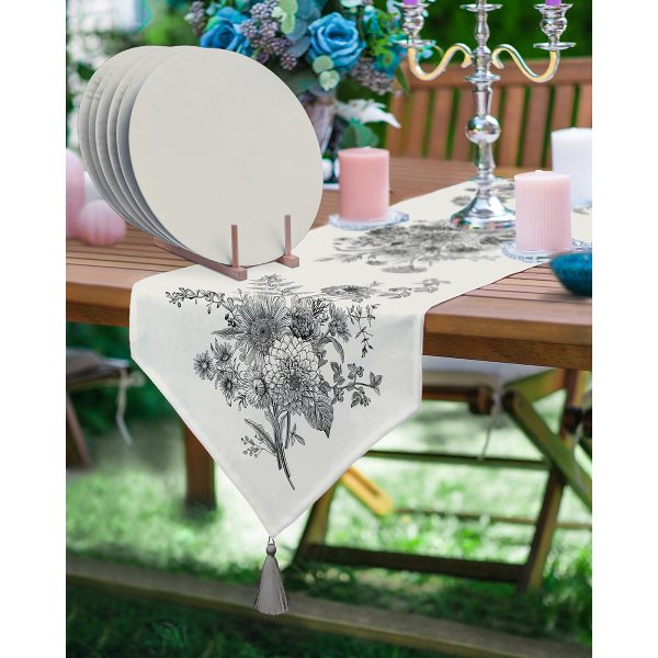 Realhomes Krem Zemin Karakalem Çiçekler Üçgen Püsküllü Runner 1 Adet & 6 Adet Krem Rengarenk Supla