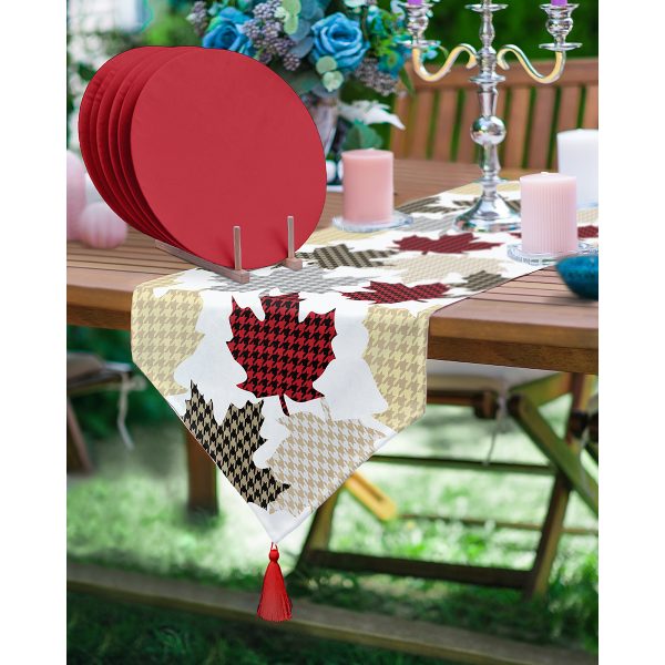 Realhomes Renkli Ekose Yaprak Tasarımlı Üçgen Püsküllü Runner 1 Adet & 6 Adet Bordo Renkli Supla