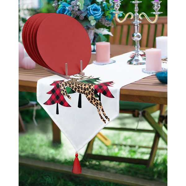Realhomes Ekose Çam Ağacı & Geyik Desenli Üçgen Püsküllü Runner 1 Adet & 6 Adet Bordo Renkli Supla