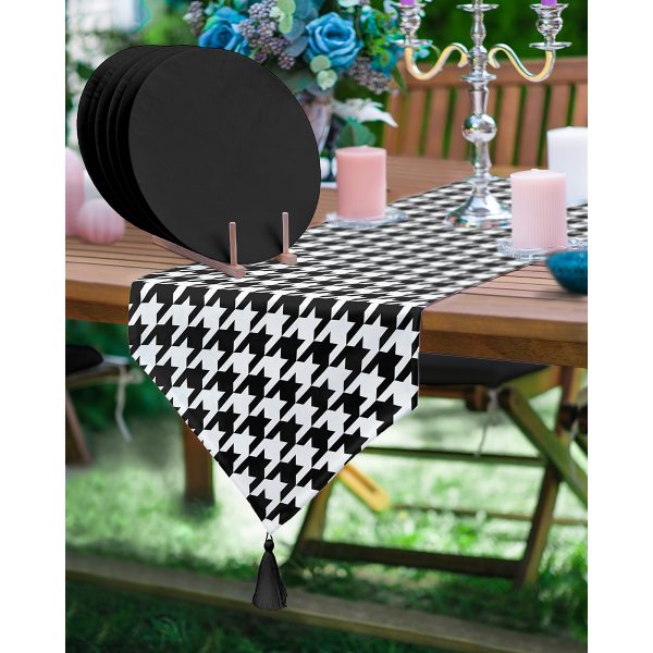Realhomes Siyah Beyaz Dama Desenli Üçgen Püsküllü Runner 1 Adet & 6 Adet Siyah Renkli Supla