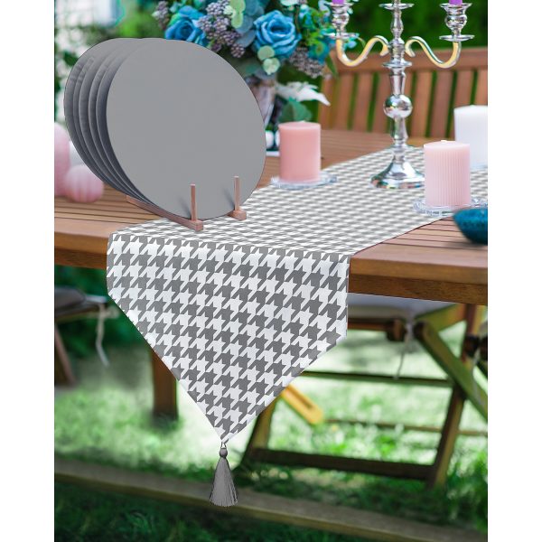 Realhomes Gri Kazayağı Desenli Üçgen Püsküllü Runner 1 Adet & 6 Adet Gri Renkli Supla
