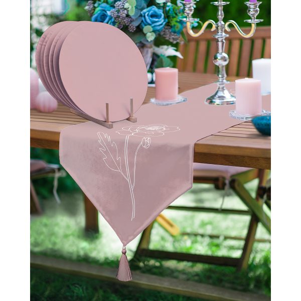Realhomes Pudra Rengarenk Beyaz Çiçekli Üçgen Püsküllü Runner 1 Adet & 6 Adet Pudra Rengarenk Supla