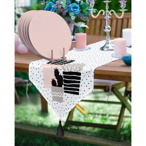 Realhomes Puantiye Zemin Kaktüs Tasarımlı Üçgen Püsküllü Runner 1 Adet & 6 Adet Pudra Renkli Supla