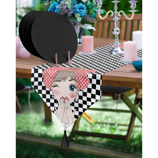 Realhomes Damalı Zeminde Öpücük Atan Kız Temalı Üçgen Püsküllü Runner 1 Adet & 6 Adet Siyah Renkli Supla