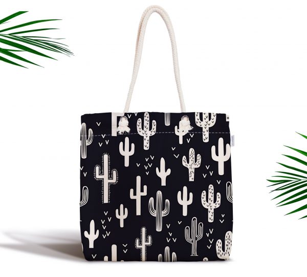 Siyah Beyaz Kaktüs Temalı Özel Tasarım Fermuarlı Kumaş Çanta