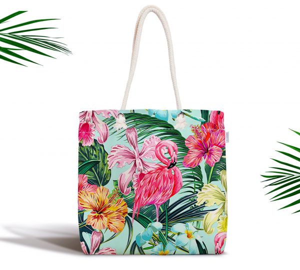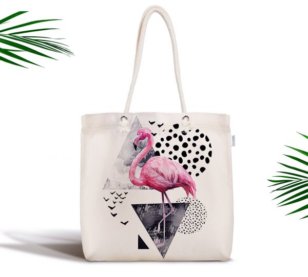 Martı Desenli Flamingo Temalı Dijital Baskılı Fermuarlı Kumaş Çanta