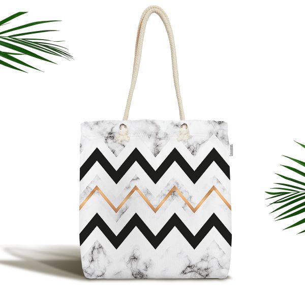 Mermer Zemin Geometrik Zigzag Tasarımlı Fermuarlı Kumaş Plaj Çantası
