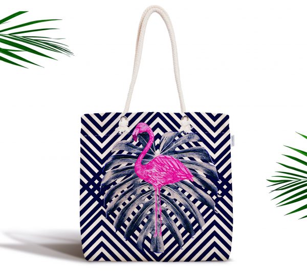 Lacivert Zeminli Flamingo Desenli Dijital Baskılı Kumaş Çanta