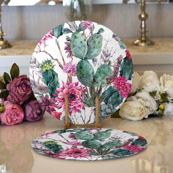 Realhomes Beyaz Zeminli Renkli Kaktüs Desenli Dijital Baskılı Modern 2’li Yuvarlak Servis Altlığı – Supla