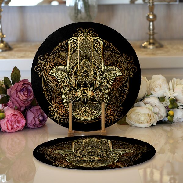 Realhomes Siyah Zeminde Mandala İçinde Gold Fâtımâ’nın Eli Motifli Modern 2’li Yuvarlak Servis Altlığı – Supla