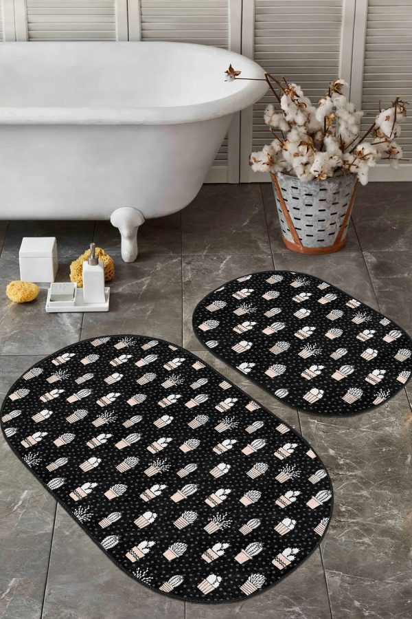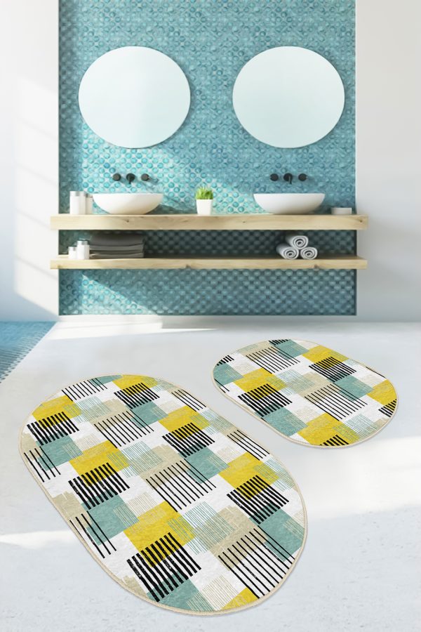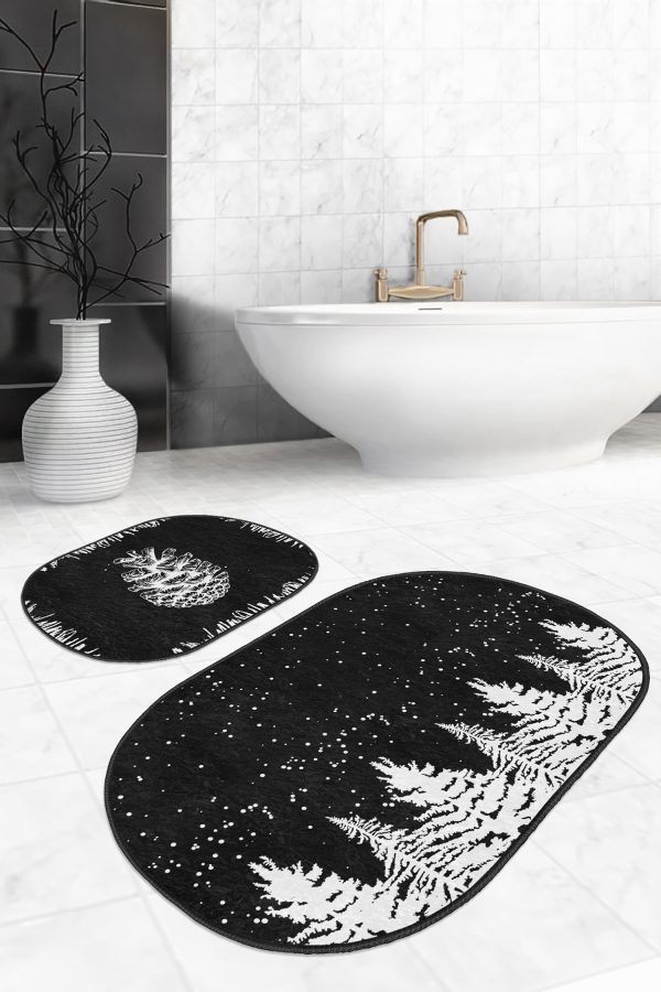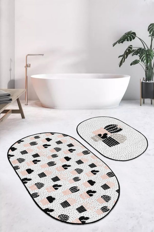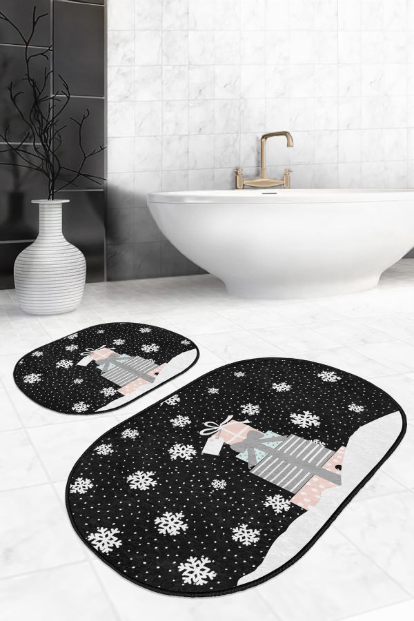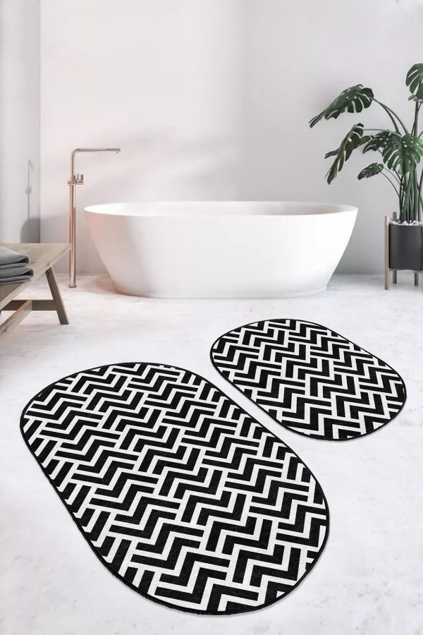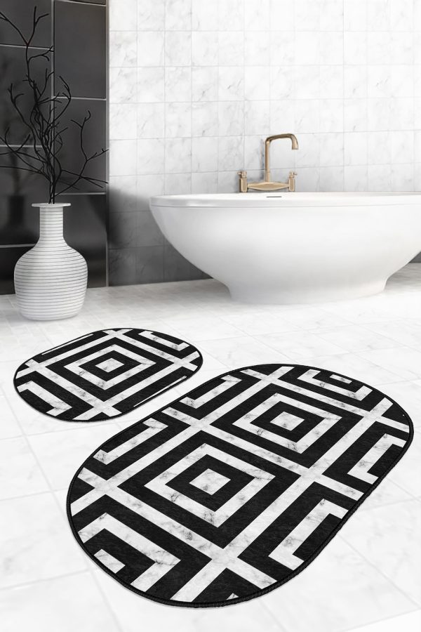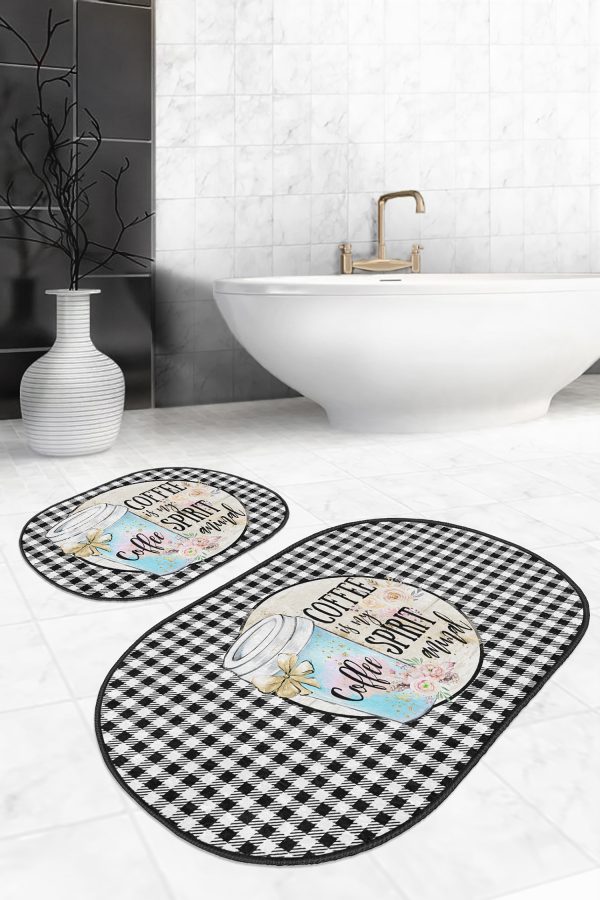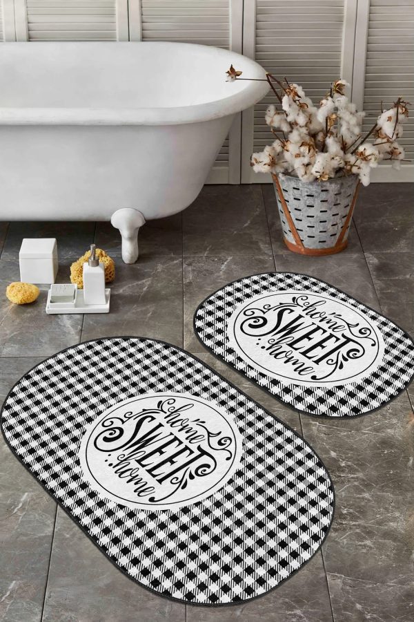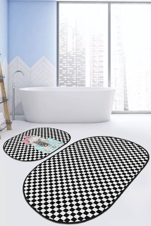 Siyah Beyaz Ekose Motifli 2’li Oval Kaymaz Tabanlı Mutfak Paspas Takımı
