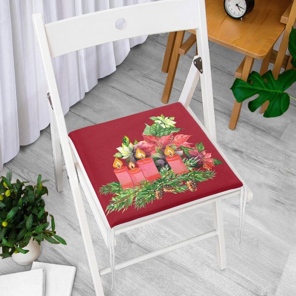 Bordo Zemin Çam Yapraklı Mum Tasarımlı Dijital Baskılı Fermuarlı Sandalye Minderi