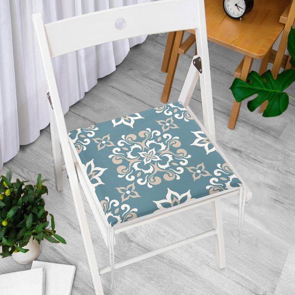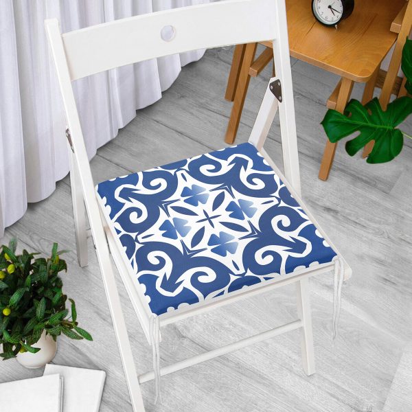 Mavi Zemin Üzerinde Çini Desenli Dijital Baskılı Modern Fermuarlı Sandalye Minderi