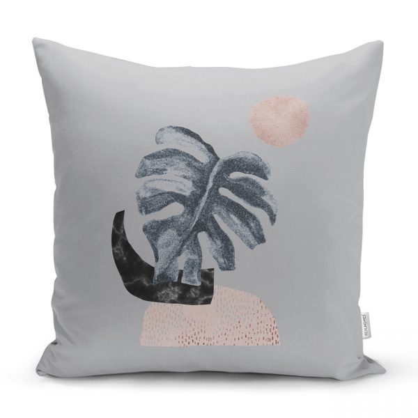 Gri Zemin Üzerinde Tropik Yaprak Desen Baskılı Yastık Kılıfı