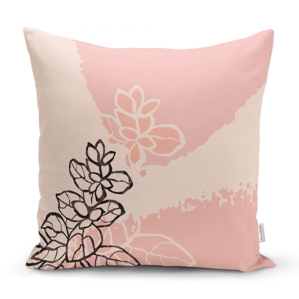 Gri Zemin Üzerinde Pembe Beyaz Yaprak Motifli Dekoratif Yastık Kılıfı