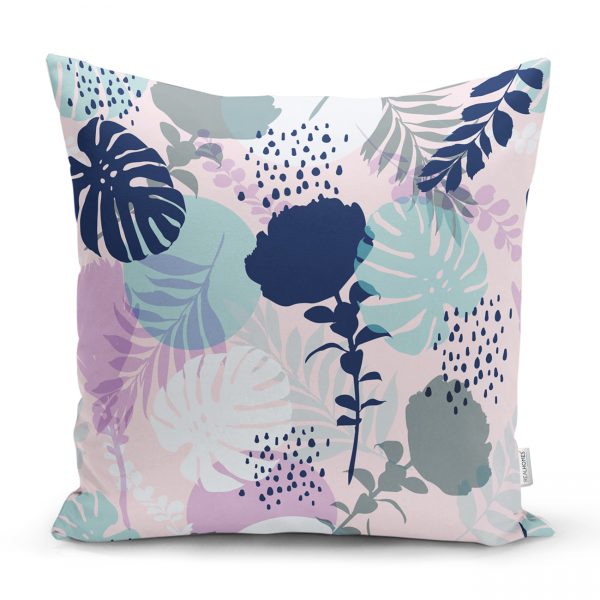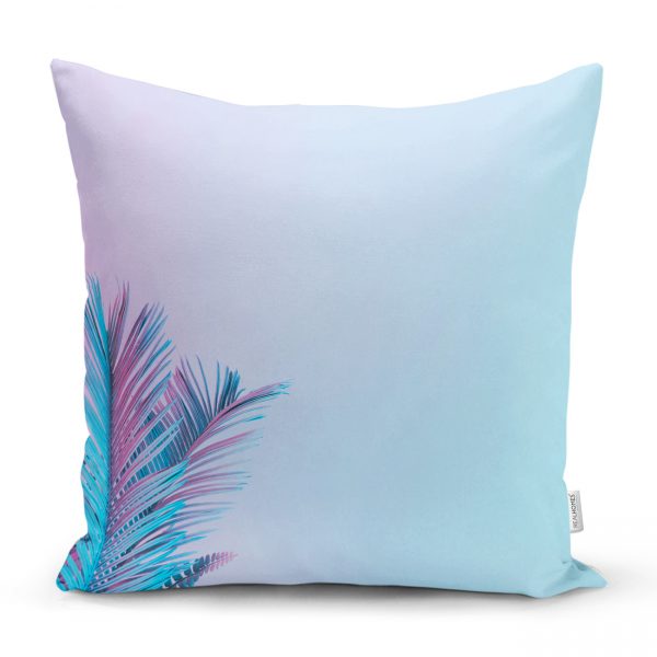 Toz Mavisi Zeminli Tropik Yapraklı Özel Tasarım Dijital Baskılı Yastık Kılıfı
