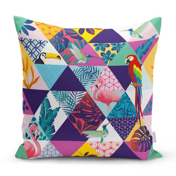 Geometrik Üçgen İçerisinde Kuş Baskılı Kırlent Kılıfı