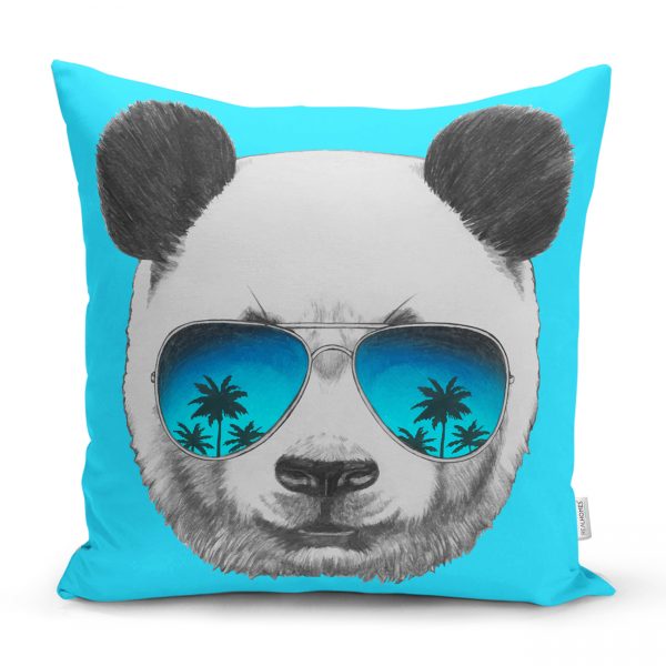 Mavi Zeminde Gözlüklü Cool Panda Motifli Dekoratif Kırlent Kılıfı