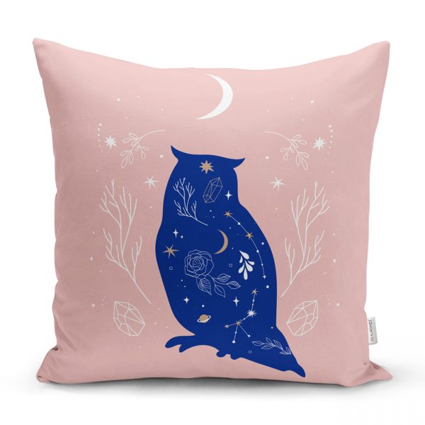 Bej Pembe Zeminde Mavi Baykuş Motifli Dekoratif Kırlent Kılıfı