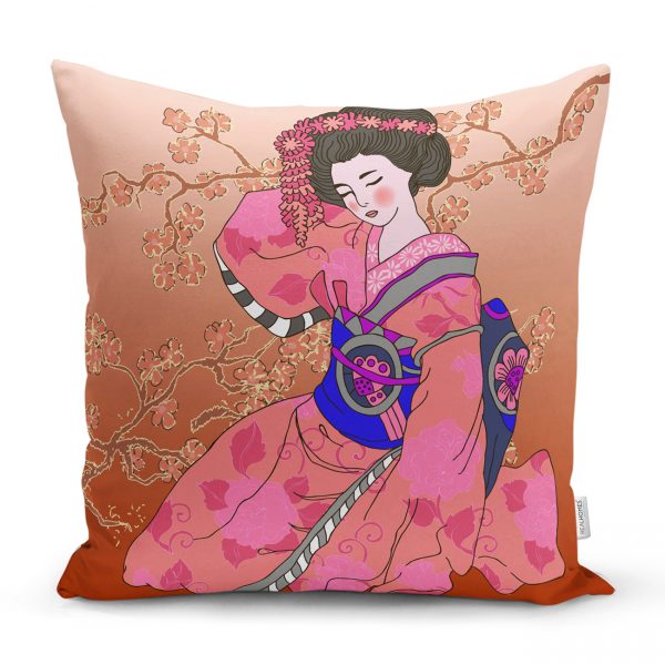 Gül Motifli Yelpaze Tutan Japon Kadın Motifli Dekoratif Kırlent Kılıfı