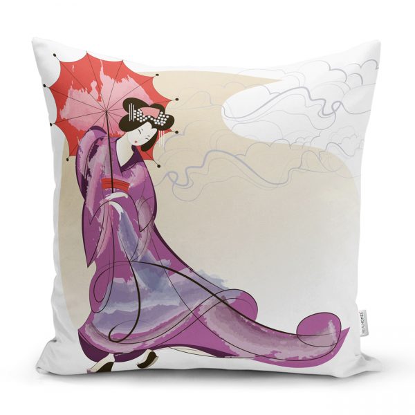 Mor Elbiseli Kırmızı Şemsiyeli Japon Kadın Desenli Modern Kırlent Kılıfı