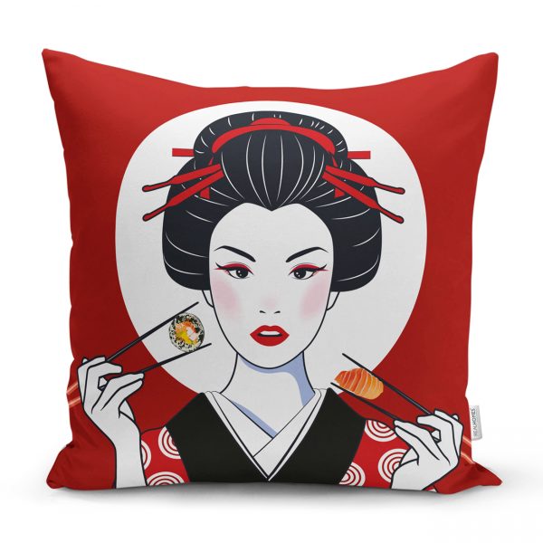Suşi Yiyen Japon Kız Motifli Modern Yastık Kılıfı
