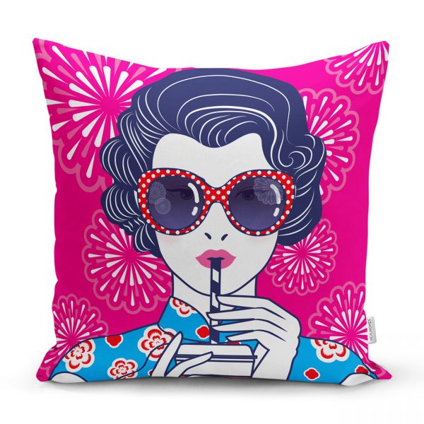 Pembe Zeminde Havai Fişek Figürlü Gözlüklü Fashion Girl Modern Kırlent Kılıfı